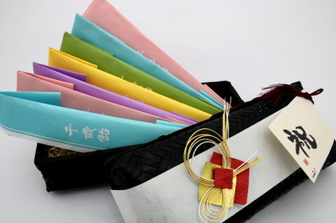 上品な網代箱の中には一つ一つが手作りの千歳飴を入れ、 和紙の帯掛けと水引、祝詞としてカードを添えた千歳飴ギフトです。